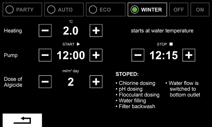 Lorsque le mode hivernal est activé, la circulation de l’eau se fait automatiquement par la bonde de fond. Les fonctions chlore, pH, floculant et contre-lavage automatique sont désactivées. Seul le dosage d’algicide maintient la bonne qualité de l’eau. La pompe de filtration continue à fonctionner chaque jour selon le temps de filtration prédéfini.